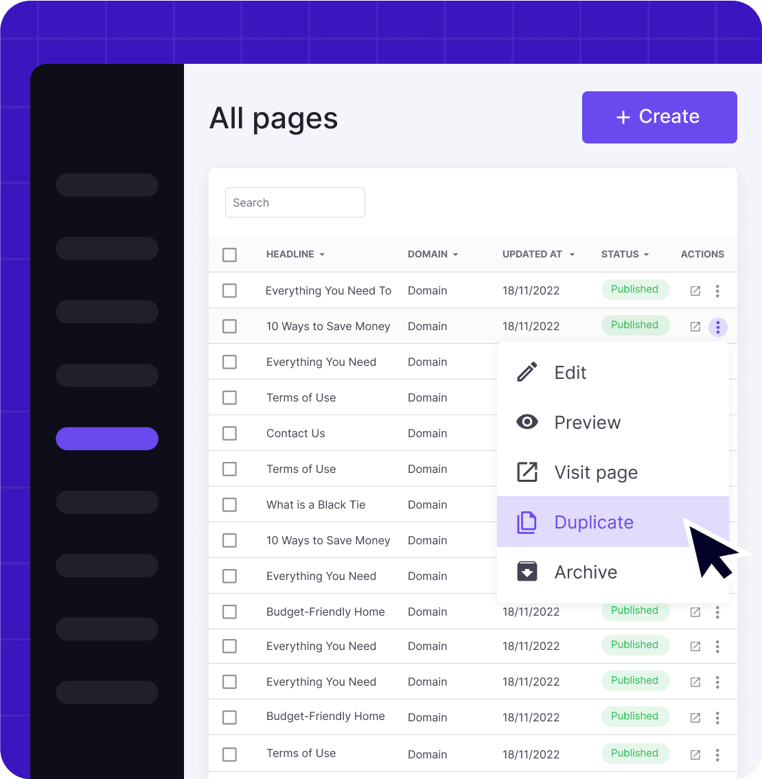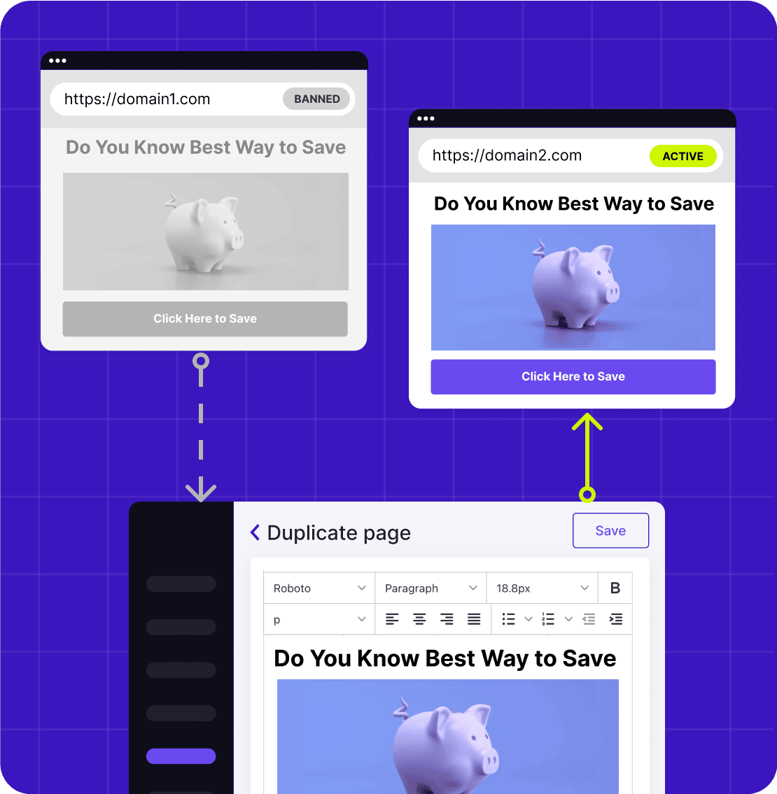 Launch, edit and duplicate landing pages on multiple domains in minutes. Focus on activities that actually make you money: launching and optimizing campaigns.